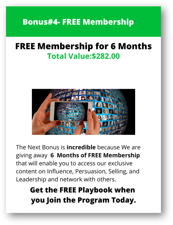 A free Webinar attendance once a month, every first of the month for 12 months valued at $1800. starting from August 2022. I will be sharing my latest thinking on Influence, Persuasion, Selling, Negotiation and Leadership. I will be with you for a year and you can ask me questions and clarifications.